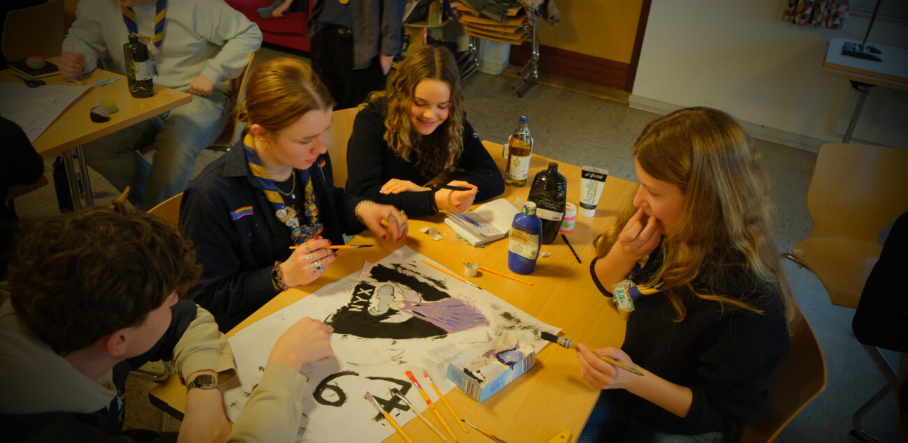 Der Samstag war der intensivste Tag. Nach dem Frühstück begann eine Einheit zu den Methoden der Pfadi-Stufe, bei der wir viel über Spiele, Gruppenstunden und den Umgang in der Gruppe gelernt haben. Beim Mittagessen wurden die Kurssippen eingeteilt. Da vorher niemand wusste, in welcher Gruppe man ist, war die Spannung groß. Danach planten wir eine eigene Sippenstunde und hatten Zeit fürs Groupbonding, bei dem wir unter anderem Wimpel malten. Später plante jede Kurssippe ein Großspiel.